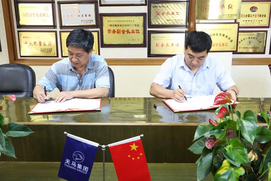 天马科技陈庆堂董事长(右)与福建师范大学福清分校陈盛校长(左)签订校企战略合作协议