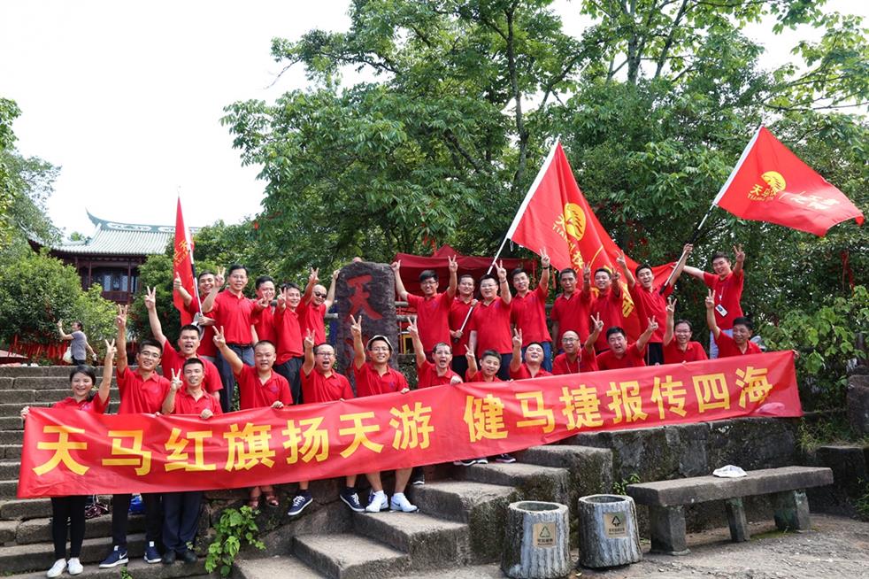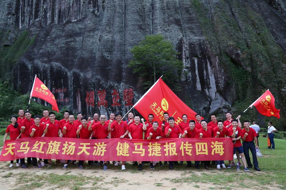 天马科技讯 “天马红旗扬天游,健马捷报传四海。”7月19日,世界自然与文化双世遗产胜地武夷山天游峰顶传来天马人的阵阵爽朗的笑声。为丰富、活跃集团员工的业余文化生活,和着2017年半年度经营分析会擂响的战鼓,天马科技在经营分析会结束后,组织三十多名集团精英代表挑战自我,开展了勇攀武夷山第一胜地天游峰活动,并在其后进行九曲漂流、观看《印象大红袍》山水实景演出,体验武夷山文化,积蓄冲刺年度经营目标的力量。