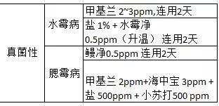 4、注意观察及早发现及时对症治疗。鳗鱼健康时活动良好,发病时活动异常、食欲下降,要及时检查确诊。检查内容包括皮肤粘液、内脏器官(肝、胆、肠、胃、肾)、鳃组织(主要检查寄生虫、霉菌、细菌),另处还可通过肉眼观察以及实践经验进行判断,有的放矢地选择药品对症下药。如鳗鱼发生鳃霉病要用亚甲基兰而不能用抗菌素。鳗鱼常发生的病害及治疗方法笔者总结如下表。