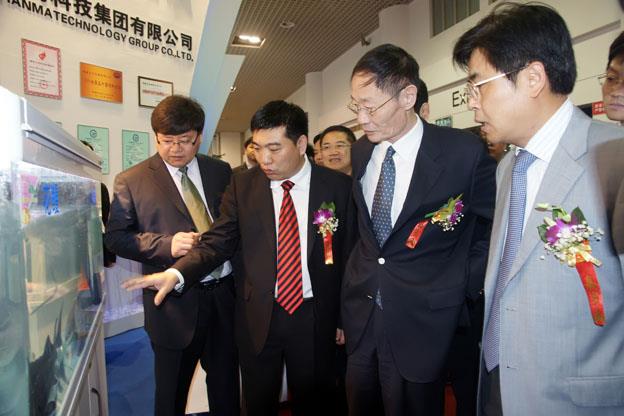 陈庆堂(左二)向农业部高鸿宾副部长介绍水产品及天马的相关配合饲料