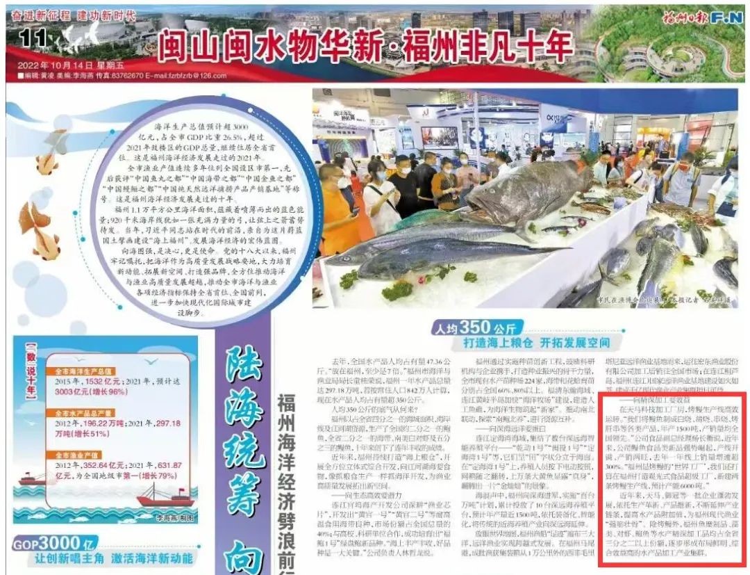 天马科技讯 10月14日,福州日报刊登专版报道《闽山闽水物华新 福州非凡十年》,报道了天马科技集团布局鳗鱼食品全产业链,以高品质预制菜向精深加工要效益,引领国鳗崛起,引发了社会的广泛关注。报道如下↓↓↓